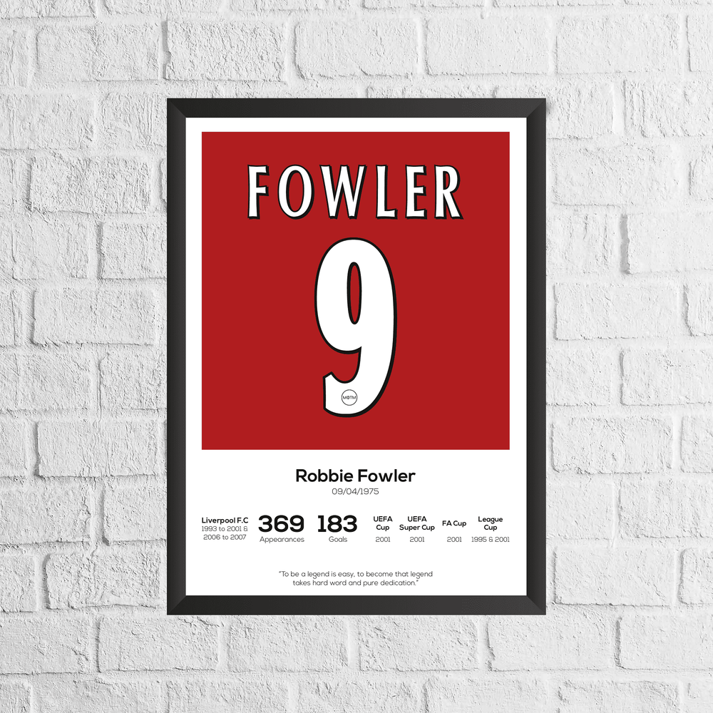 Remember the amazing career of legend, striker and number 9, Robbie Fowler. Fowler is a scouse folk hero and often referred to as 'God'. This print is inspired by the 2001 home shirt, which Fowler starred in for his hometown club. This high quality football print is the perfect gift for any Robbie Fowler fan.