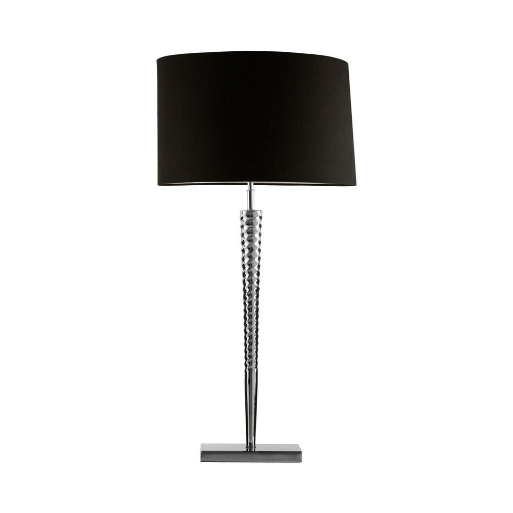 The elegantly contoured threads on its slender, tapered surface giving it a decorative texture. Contrasting its silver tones, a black fabric shade is held atop to create an ambient glow.